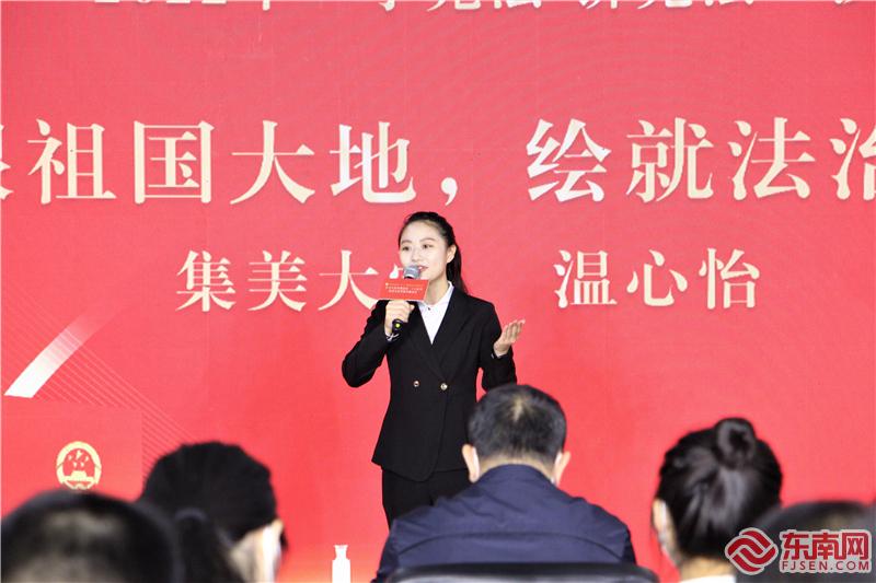 集美区“12·4”国家宪法日主题宣传活动“学宪法 讲宪法”演讲比赛现场,图为一等奖获得者、集美大学学生温心怡。(东南网记者 李霖 摄) 东南网12月8日讯(本网记者 李霖 通讯员 李洁珍)为深入学习宣传贯彻党的二十大精神,进一步普及宪法知识、弘扬宪法精神、树立宪法权威,12月8日下午,2022年厦门市集美区“12·4”国家宪法日主题宣传活动在集美区人才培训中心举行。集美区政府副区长、公安分局局长杨晓峰、集美区委宣传部常务副部长唐金富等出席活动。 集美是蜚声海内外的百年学村,也是集聚青春之美的活力之城。当前,集美区正加快推进青年发展友好型城区建设。作为集美区开展“宪法宣传周”的重要活动之一,今年集美区“12·4”国家宪法日主题宣传活动特别聚焦青少年群体,致力于让宪法成为年轻人成长成才的必修课,让宪法信仰植根人心,让宪法精神薪火相传。 此次宪法日主题宣传活动重头戏——“学宪法 讲宪法”演讲比赛中,来自集美大学、厦门理工学院、厦门医学院、福州大学厦门工艺美术学院和集美大学诚毅学院五所高校的大学生就以青年人的视角,或结合自身成长历程娓娓道来,或从真实事件和典型案例入手侃侃而谈,表达时代青年弘扬宪法精神,努力争当宪法的自觉践行者和坚定捍卫者的决心。 经过激烈角逐,最终,集美大学温心怡、厦门医学院闻子健、集美大学诚毅学院马若涵分别获得一等奖、二等奖、三等奖,福州大学厦门工艺美术学院张婉玲、厦门理工学院黄楚婷获得优秀奖。 集美大学学生温心怡演讲的题目是《扎根祖国大地,绘就法治新篇》,她结合自身经历,为现场观众展开了一幅幅新时代乡村振兴的法治画卷。她说,作为一名从乡村走出的孩子,她选择法学专业,也正是为了能接续乡村法治建设,用自己的力量将法治光辉播撒祖国大地。 |