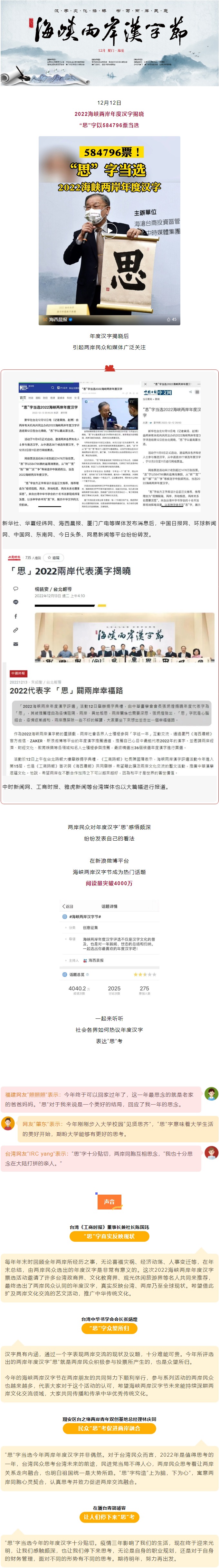 2022海峡两岸年度汉字揭晓 “思”字以584796票当选