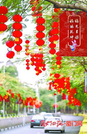 在南山路放眼望去,满眼都是亮丽的“中国红”。 厦门日报讯(文/记者 吴燕如 叶舒扬 图/记者 林铭鸿 张江毅)福气满满迎新春,“福”文化特色主题标识和海报随处可见,美好祝福令人心生欢喜;主干道、公园景区、重要节点等地段装扮一新,火红的灯笼和彩灯、花化彩化景观吸引眼球,人们纷纷拍照留念……兔年春节脚步渐近,厦门年味越来越浓,喜庆元素点缀着厦门的大街小巷,欢乐祥和、充满福气的节日氛围扑面而来。昨日,记者来到街头感受年味,捕捉市民喜迎新年的暖心画面。 白天喜看景 “中国红”辉映花卉景观 市民游客纷纷拍照留念 昨日下午,记者在湖里区采访发现,不少主次干道和前街两侧绿化树都已经挂上了鲜艳的大红灯笼、红灯笼串珠和装饰旗等。行走在殿前街道长乐路,机场T4航站楼附近的灯杆上挂满“福”文化海报;漫步于禾山街道金湖路等地,放眼望去,满眼都是亮丽的“中国红”,焕然一新,让人情不自禁感叹——就要过年啦! 在湖里街道的海天路、华昌路、南山路等路段,红灯笼串珠整齐悬挂在道路两旁的灯杆或树干上,为绿意盎然的环境增添一抹鲜艳的红色,不仅让年味愈加浓郁,也为远行归家的游子点缀了团圆的归途。居住在华昌路附近的陈先生告诉记者,这条路连同附近的华美空间都变得年味十足,“想到在外地的孩子和朋友都是时候回家了,团圆的期盼让人感觉充实、高兴、幸福!” 而在国际邮轮中心附近,最引人注目的当属色彩艳丽、层次丰富的花卉景观。姹紫嫣红的花卉与郁郁葱葱的绿植相映成趣,一面是“欢度春节”,另一面则写着“文明让生活更美好”,引来不少市民和游客驻足观看、拍照留念,共同分享越来越浓厚的节日气息。 湖里街道有关负责人告诉记者,在布展团队的大力支持下,辖区内的春节氛围布置内容旨在突出浓厚的节日气氛,让崭新的布置融入原有的“烟火气”,为市民游客带来浓浓年味。 灯笼挂,年味起。岛外各个街道同样洋溢着喜庆的新春氛围。在翔安区马巷街道,巷南路、黎安小镇附近等路段张灯结彩,走在路上就能感受到热烈喜庆的节日气息。