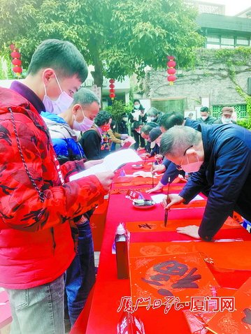 书法家现场手书春联送祝福。 (记者 吴燕如 摄) 厦门日报讯(记者 吴燕如 通讯员 夏思萱)福兔呈祥,福满乾坤。兔年春节进入倒计时,中心城区思明越发充盈着火红的喜庆氛围。主次干道、公园景区、重要节点、车站周边等地段装扮一新,“福”文化主题海报充满特色,大小灯笼和彩灯、花化彩化景观令人赏心悦目。迎面扑来的浓郁年味受到央视多个栏目持续关注和报道。 氛围布置让人心生欢喜,思明区热气腾腾的文化惠民活动更是深受市民群众欢迎。送福送春联、文艺演出、志愿服务市集等活动暖心登场,宣传党的二十大精神,丰富群众精神文化生活,思明区将一份份年味十足的“文化年货”送到居民家门口。 据悉,今年春节前后,思明区以“文明有福 爱暖思明”为主题,精心策划了“我们的中国梦”文化进万家系列活动,同时各街道社区和单位也组织了各具特色的活动,全区共有200余场文化惠民活动。丰盛的文化大餐让居民群众真切感受到节日的温暖和传统文化的魅力。 [氛围浓] 线上线下结合 受到央视关注和报道 思明老城区八市,张灯结彩,人来人往中的各式摊位前,浓烈的年味在烟火气中升腾。近日,央视《正点财经》《第一时间》《共同关注》《新闻直播间》《午夜新闻》等11个栏目陆续报道了思明海鲜特色年货市场——八市。央视记者带大家逛八市、买海鲜、淘年货、品闽南美味,让全国朋友感受思明区独特的年味。 八市所在的鹭江道片区,道路两侧大小灯笼高高挂起,鲜艳的五星红旗在风中飘扬。鹭江街道鹭江道社区居民陈小夏拍摄了很多照片,“今年氛围特别红火,白天赏美景,晚上看夜灯,心情特别好,就盼着兔年早点到来。” 人气颇旺的中山路,四组“萌兔”景观上线,瑞兔与鲜花相互掩映迎春迎客香满溢,吸引市民游客打卡拍照。近日,央视《新闻联播》也报道了中山路、鹭江道、湖滨北路的春节氛围布置。 放眼思明区10个街道,因地制宜的氛围布置给城市披上喜庆的彩衣。今年,思明区统筹谋划、精心选点,相关部门街道用时令花草、传统中国红,打造五彩烂漫、喜气洋洋的新春氛围。 线下红红火火,线上同样一派热闹。思明区融媒体中心精心策划“遇见思明”系列短视频,带领市民游客沉浸式走进思明景区、商圈等地,为大家春节假期休闲娱乐提供攻略。 [活动多] 送知识送服务送欢乐 深受市民欢迎 “福气降临阖家福,春光辉映满堂春。”寓意美好祝福的手书春联在书法家的挥毫泼墨下新鲜出炉。梧村街道文屏社区的居民陈女士接过这副春联,喜笑颜开说道:“闻着翰墨香,特别有年味,把这副福气满满的春联贴到大门上,新的一年生活越来越好。” 这温馨的一幕发生在思明区图书馆。近日,“我们的节日·春节”——“文明有福 爱暖思明”2023年“我们的中国梦”文化进万家走进梧村街道,吸引居民纷纷前往参加。 送知识,送服务,送欢乐。近段时间以来,由思明区委宣传部、区委文明办、区文联、区文旅局携手思明区文化馆、各街道社区新时代文明实践所(站)联合举办的“我们的节日·春节”——“文明有福 爱暖思明”2023年“我们的中国梦”文化进万家系列活动,将丰富多彩的活动送到街道、社区、公园、广场。目前该系列活动已举办8场,在春节元宵期间,还将陆续举办5场活动。此外,思明区还举办了多场文化科技卫生“三下乡”集中服务活动,现场不仅有党的二十大报告分享诵读、经典歌曲演唱、闽南曲艺等精彩节目,还同步开展义诊、义剪、健康指导、法律咨询、文物保护普法宣传、科学普及、移风易俗宣传等活动,让文明健康绿色环保的生活方式更加深入人心。 新春歌会、游园活动、包饺子、剪窗花、画福兔、插花……从去年12月底以来,思明区10个街道98个社区,依托新时代文明实践中心(所、站)陆续开展了内容丰富的迎新春活动,各文明单位也用心策划主题活动。接下来持续至元宵节,思明区还将陆续开展喜庆活动,延续年味,传递幸福。 思明区春节元宵期间 文化活动安排