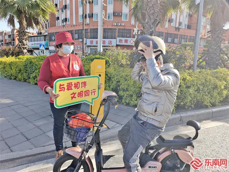 志愿者劝导居民戴好安全帽(陈燕贞 摄) 东南网1月25日讯(本网记者 李霖 通讯员 陈秀治 许镇洪)1月24日是大年初三,厦门市集美区灌口大道安仁大道交叉路口,人流车流密集,一群穿着红马甲,手举文明交通标语的身影格外显眼。原来,灌口镇新时代文明实践所、双岭新时代文明实践站组织志愿者以“文明交通,平安过年”为主题,在这里开展文明实践志愿服务活动。 作为“志愿服务送关爱 文明实践树新风”春节系列志愿服务活动之一,此次活动旨在弘扬志愿服务精神,倡导文明出行,助力平安厦门建设,共建礼让为美、文明出行新风气,为保障群众文明平安过年贡献志愿服务力量。 志愿关爱“新春不打烊”。在集美区新时代文明实践中心的指导下,春节前开始,灌口镇新时代文明实践所、站紧密联动,围绕“文化进万家”“关心关爱”“文明过节”“平安厦门”等主题开展文明实践志愿服务活动,组织动员广大群众积极投身新时代文明实践工作,丰富群众精神文化生活,大力宣传“福”文化内涵,培育时代新风新貌,营造“文明有福”、喜庆安康、昂扬向上的节日氛围。