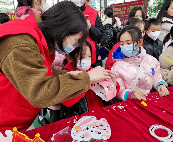 图二:志愿者教孩子们制作灯笼。 作为2023年厦门市文化科技卫生“三下乡”活动之一,市体育局、区政法委、后溪中学、后溪中心幼儿园、厦门市新华书店等单位为后溪镇村(居)带来了新春文艺汇演、图书捐赠、游园活动等各种“新春福利”。活动现场还特别邀请了书法家、中学生为市民写春联、送福字。此外还有志愿者教孩子们剪窗花、制作灯笼,介绍春节的来历和风俗。红色春联纸、窗花纸、玉兔灯笼为冬日增添了满满的年味和热烈的节日氛围。(文/图 记者 帅浩 通讯员 张艳红 来源:集美报) |