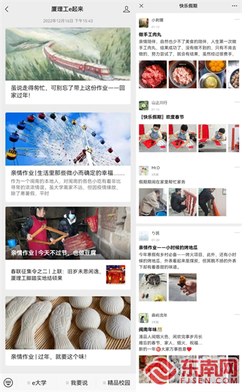 “厦理工e起来”微信平台“快乐假期”互动社区截图(厦门理工学院供图) 东南网2月7日讯(本网记者 李霖 通讯员 曾妙龄)一道道传统美食、一张张新老照片、一段段或质朴或细腻的文字……寒假期间,厦门理工学院学子们通过“厦理工e起来”微信平台上的“快乐假期”互动社区,随时随地发布“亲情作业”,在线分享回家的幸福,感受过年的喜悦,体会亲情的温暖。 “回家过年,亲情陪伴”是厦门理工学院在每年寒假布置给每名厦理工学子的一份具有特殊意义的寒假作业。自2012年起,厦门理工学院面向全体在校学生开展亲情教育。2015年寒假开始,借助“厦理工e起来”微信平台,学校首次给同学们布置“亲情作业”,力图让每一位学生在具有丰富知识、扎实技能的同时,更具浓烈的亲情观念与家国情怀。 8年来,同学们用数百篇“亲情作业”投稿、上万条“快乐假期”社区发帖、上百万次亲情话题互动,让“厦理工e起来”无论酷暑严寒,都成为亲情涌动、沐浴爱与责任的海洋。 今年寒假伊始,“快乐假期”互动社区如期开放。为了更好地向全体师生乃至全社会展示亲情作业的独特魅力,学校精心选择部分学子优秀、感人的投稿文章进行推送分享。 不仅如此,厦门理工学院还在该平台组织“春联征集令”和“除夕抢红包”活动,通过生动有趣的线上互动形式,进一步营造出喜庆、祥和的节日气氛。 |