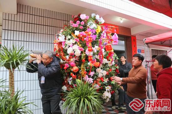 村民抬着“丁瓯”出门送祝福(朱毅力 摄) 东南网2月8日讯(本网记者 夏菁 通讯员 童心悦)近日,厦门市翔安区古宅村抢“丁瓯”仪式时隔四年重新举办,规模空前盛大,村里78户添丁人家齐聚一堂,喜气洋洋抬“瓯”到祖祠。 翔安“丁瓯”是一项传统祭祖民俗活动,也是省级非物质文化遗产,包含装丁瓯、迎丁瓯、献丁瓯、抢丁瓯、庆丁瓯五个环节。在过去,每年元宵节,凡是新添男丁的家庭,都要准备一座“丁瓯”抬到大祖厝里祭祀列祖列宗。 “丁瓯”的形状像一座“宝塔”,底部是竹篮,里面装满大米,寓意五谷丰登,最上头是整只羊,下面环绕这头羊挂满鸡、鸭。外围装饰绿叶,各色彩花,还有应景的兔年灯笼,打扮成树状,象征家族人丁兴旺、枝繁叶茂。现场,七十八户添丁人家,七十八座装饰得丰满漂亮“丁瓯”被抬进祖厝,摆放整齐,颇为壮观。
