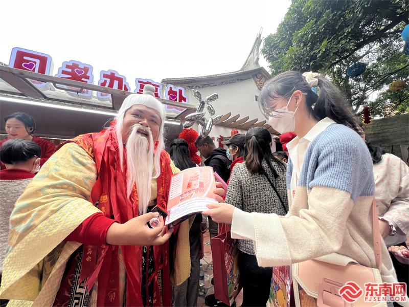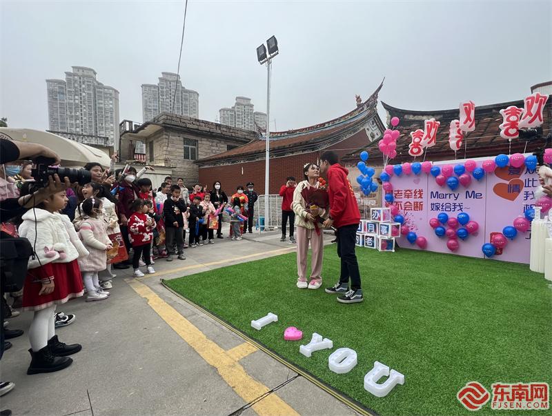 两岸伴侣分享幸福喜悦(东南网记者 李霖 摄) 搭建两岸青年友谊桥梁 开幕仪式上,两岸青年携手带来《心花开》《甜蜜蜜》《告白气球》等情歌串烧,深情演绎两岸新人从相识、相处到喜结连理的心动之旅,领导嘉宾为4对两岸伴侣送上象征幸福美满的姻缘绣球,将现场气氛推向高潮。 庙会遇佳节,两岸青年实现“双向奔赴”。作为全国青年发展型县域试点和全省唯一两岸融合发展县域集成改革试点区,目前,集美正着力打造青年发展友好型的中国式现代化城区。恰逢西方情人节,本届庙会引入台北霞城城隍庙民间“月老”的文化IP,组织“城内月老包月送对象”“脱单漂流瓶”“求婚告白加油站”等系列大型“相亲交友”活动,打开了解两岸月老文化的窗口,搭建两岸青年友谊的桥梁,全方位提升在集青年的归属感、获得感和幸福感。 “求婚告白加油站”响起一阵阵欢呼,开幕式当天,来自台湾台中的青年张群就手捧鲜花,单膝跪地,在“月老”的帮助下,向相恋多年的内蒙古姑娘深情告白。他说,求学期间,他和女友相识、相恋,到了不少城市。毕业后,两人被这里浓厚的创业氛围、优厚的政策打动,决定留在厦门,携手创业。 值得一提的是,2月14日情人节当晚18点,一场闽南古厝版本的“喜结良缘”单身情歌音乐派对将华丽登场,现场采用盲盒配对组CP、音乐不NG挑战等新颖形式满足年轻人交友需求,让有趣的灵魂相互碰撞,邂逅甜蜜恋爱。