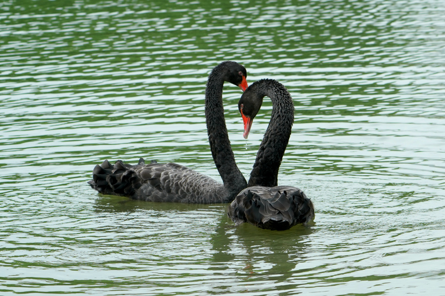 厦门园博苑黑天鹅“比心”秀恩爱 湖中倒影“心心相印”