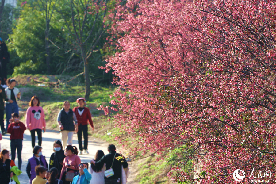 正当踏春赏花好时节,鳌冠村的樱花林迎来不少市民游客。人民网 陈博摄 人民网厦门2月18日电 (陈博、余乃鎏)二月里来百花开,胜日寻芳醉樱花。正当踏春赏花好时节,连日来,不少市民游客来到厦门市海沧区鳌冠村,这里的一处樱花林“山樱发欲然”,盛放如云霞,点染烂漫春光。 小园新种红樱树,闲绕花枝便当游。在海沧区,相对于众所周知的天竺山、大屏山郊野公园的樱花,位于鳌冠村的樱花林较为“小众”。然而,来此寻胜的市民却别有一番“小确幸”:淡粉色的樱花夹道盛放,花朵一簇簇、一团团缀满枝头,蜂蝶在花间飞舞,鸟儿在树枝上嬉戏打闹,一片生机勃勃之景;漫步在樱花树下,赏看红艳欲滴,偶有一阵微风吹过,花瓣即飘落地面,“春风才起雪吹香”的妙境油然而生。