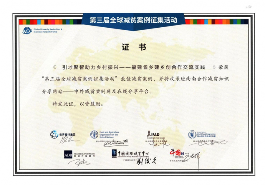 由中国国际扶贫中心、中国互联网新闻中心、世界银行、联合国粮食及农业组织、国际农业发展基金、联合国世界粮食计划署、亚洲开发银行联合发起的第三届全球减贫案例征集获奖名单揭晓,福建省10个案例入选。其中,“引才聚智助力乡村振兴——福建省乡建乡创合作交流实践”获“第三届全球减贫案例征集活动”最佳减贫案例,为全国住建系统唯一入选案例,上述案例已被收录进南南合作减贫知识分享网站——中外减贫案例库及在线分享平台,旨在以案例为载体,推广分享各国减贫成功实践。