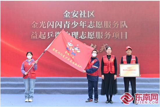 授旗、授牌仪式(东南网记者 夏菁 摄) 现场还为金光闪闪青少年志愿服务队伍、益起乒微治理志愿服务项目授旗、授牌。金光闪闪青少年志愿服务队由辖区6岁-18岁青少年组成,主要围绕助老、敬老、孝老等方面开展献爱心活动,同时在环保、助残、倡导文明行为等方面开展社区治理相关服务。而益起乒微治理志愿服务项目的志愿者是由金安社区乒乓球爱好者组成的,主要负责协助社区管理社区乒乓球设施、场地和人员,并参与洁净家园、维护小区秩序等志愿服务。 “我志愿成为一名光荣的志愿者……”现场志愿者们全体起立,宣读志愿者誓词。志愿者们将继续弘扬“奉献、友爱、互助、进步”的志愿服务精神,传递更多温暖,点燃志愿服务之光。