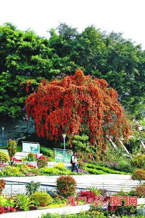 盛开的炮仗花和繁茂的古榕树相映成趣。 持续守正创新 推进由绿向美 “福兔呈祥、福满乾坤”,2023年癸卯春节期间,厦门街头巷尾花团锦簇、热闹非凡。 厦门市政园林部门在原有的绿化彩化氛围布置基础上,通过更新时令花卉、庆祝标语等形式,将深入学习宣传贯彻党的二十大精神与“福”文化宣传相结合,营造出主题鲜明、欢乐祥和、福气满满的节日氛围。 发扬工匠精神,下足绣花功夫,推动园林绿化景观“由绿向美”转变。从2017年迎接金砖厦门会晤召开,到2019年庆祝新中国成立70周年,到2021年庆祝建党百年、庆祝厦门经济特区建设40周年,从中华民族传统节日春节,到“九八”投洽会、海峡论坛、金鸡百花电影节……每逢重要节点、节日、盛会,各式造型新颖、富有时代和地域特色、文化和艺术气息的绿雕,总能让厦门穿上盛装,让近者悦、远者来。 城市绿化,既能看到新意迭出,也能记住传统乡愁。 2022年,位于厦门老城区的一株137年树龄的古榕树,受到厦门市民的广泛关注。一次是持续降雨过后,古榕树突然倒伏,市、区级绿化部门调集专家及时介入,积极抢救。另一次是,为了保护这株古榕树,厦门不惜增加建设成本和工期,特地修改调整了地铁3号线南延段厦大南门站的建设方案。 古树名木被称为“活文物”,是历史的见证者,是弥足珍贵的自然和文化遗产。 近年来,厦门不遗余力地保护古树名木,大力推行“一树一园”,打造以古树为主题的休憩区和小公园;强化“一树一策”“一树一档”,推动古树名木管理和巡查的精细化、常态化;出台福建省首个以古树名木管护和复壮为题材的地方标准——厦门市《古树名木养护技术标准》,引导提升本市古树名木精细化养护质量;出版《厦门古树名木图册》,加大宣传,提升公众对古树名木的保护意识。 2022年,厦门市对古树名木基本情况、生长状况、生长环境、养护管理、设施保护、存在问题等开展“双随机”抽查工作,摸清各区古树名木保护情况,共抽查180株古树,截至2022年12月,全市已登记挂牌的古树名木共1788株,古树名木长势基本良好。