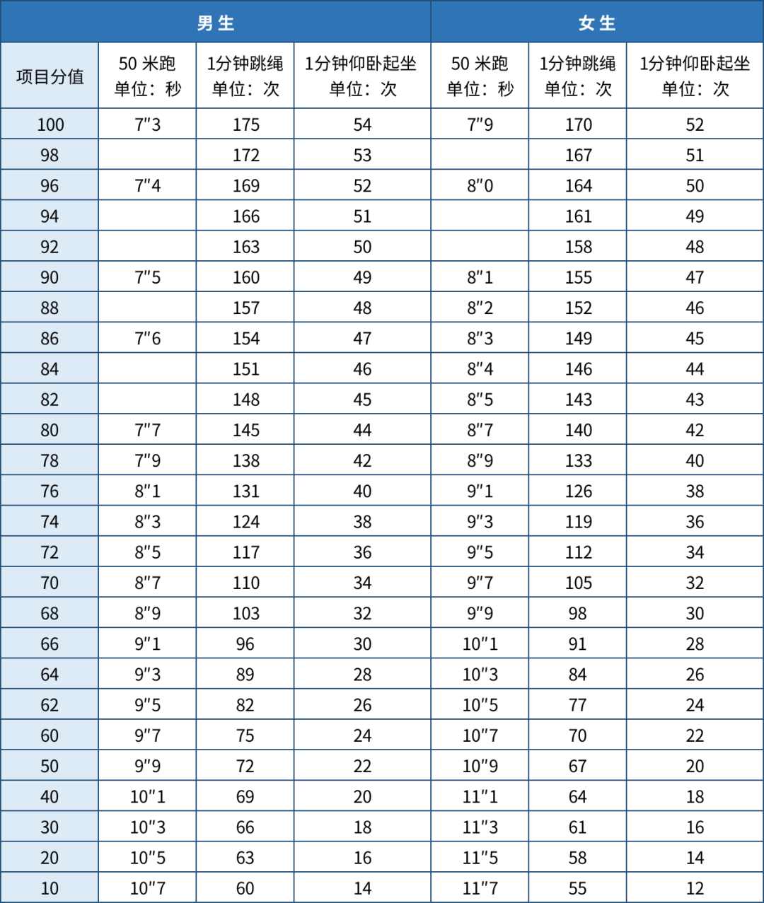 2023年中招体育考试工作方案来了 2023年中招体育考试工作方案出炉 考试时间 考试安排在4月12日至28日进行,具体时间另行通知,每天上午8:30开考,下午2:30开考。 考生应于半天内完成三个项目考试,成绩方可认定有效。 补考时间 因故未能参加测试的考生,可于5月27日至28日到市招考中心指定时间和地点参加一次补考。 项目、分值及评分标准