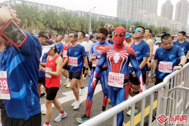“蜘蛛侠”和“超人”也在马拉松方阵中(东南网记者 刘玮 摄)