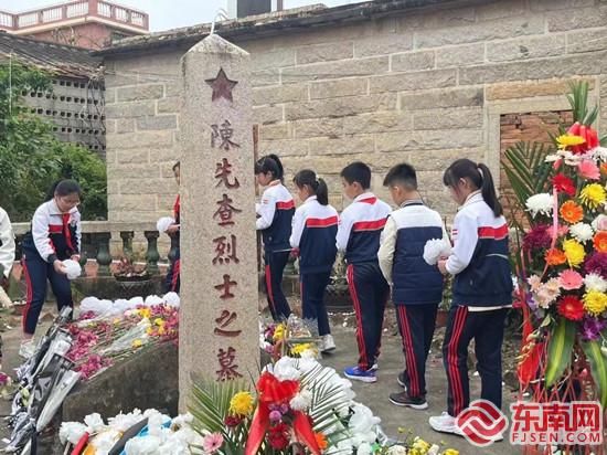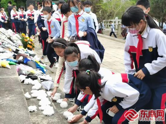 学生向烈士敬献鲜花(翔安区委文明办供图) 东南网4月7日报道(记者 夏菁 通讯员 童心悦)一年一清明,一岁一追思,近日,厦门市翔安区各中小学开展了形式多样的清明祭扫活动,表达对革命先烈的无限哀思及崇敬之情,引导翔安区未成年人从小铭记革命历史,厚植爱党、爱国情怀,赓续红色血脉,培养新时代好少年。 翔安区实验学校以“致敬先烈荣光 感悟清明之韵”为主题,在一到九年级开展清明主题班队课、巧手绘“家族树”、踏春光放风筝体验、解锁制作“清明粿”技能、缅怀先烈等活动。 翔安火炬实验学校师生代表满怀崇敬之情前往黄廷元墓,敬献鲜花,齐唱国歌、队歌,用歌声向革命先烈致以最崇高的敬意。大嶝中学开展了以“寄哀思 承遗志”为主题的清明节祭扫活动,少先队员们徒步到后山顶烈士陵园祭扫,瞻仰烈士墓,重温入队誓词,听驻岛官兵为讲述英雄三岛的故事。 莲河中学400多名师生前往莲河社区吴云振烈士墓,开展“我们的节日·清明”祭扫缅怀先烈教育实践活动。翔安一实小师生代表来到后山岩烈士公墓开展清明祭英烈活动。活动中,孩子们满怀对革命先烈的崇敬与哀思之情,传唱队歌、诵诗、献花、默哀,聆听先烈故事,传承先烈遗志。