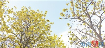 黄花风铃木开花,美不胜收。记者 林燕萍 摄 海西晨报讯(记者 林燕萍)连日来,随着气温攀升,同安区五显镇明溪村后烧自然村黄花风铃木培育基地里,成排的黄花风铃木开出浓艳的花朵,一眼望去仿佛都披挂着一身“黄金甲”。 10日下午,记者来到该基地,远远望去只见黄花风铃木像黄色的丝绸,浓烈而又亮丽。四周点缀着紫色、红色、白色的洋紫荆,汇成多彩的海洋。 据介绍,黄花风铃木学名“黄钟木”,其花色金黄,先开花后长叶,三五朵黄花汇聚一团,似一串串风铃挂在枝头,微风拂过仿佛能听到叮铃叮铃的风铃声传来,因而得名。 “之前的几场春雨把许多花都打掉了。最近天晴了,黄花风铃木迎来盛放期,花期为20天左右。”该基地养护人员曾清洁告诉记者,基地有300多株黄花风铃木,已经种了8年多,每株有3米多高。除了黄花风铃木,该基地还种植了樱花、洋紫荆、花叶榕、小叶榄仁等10多种植物。 |