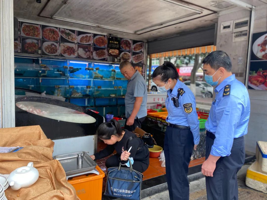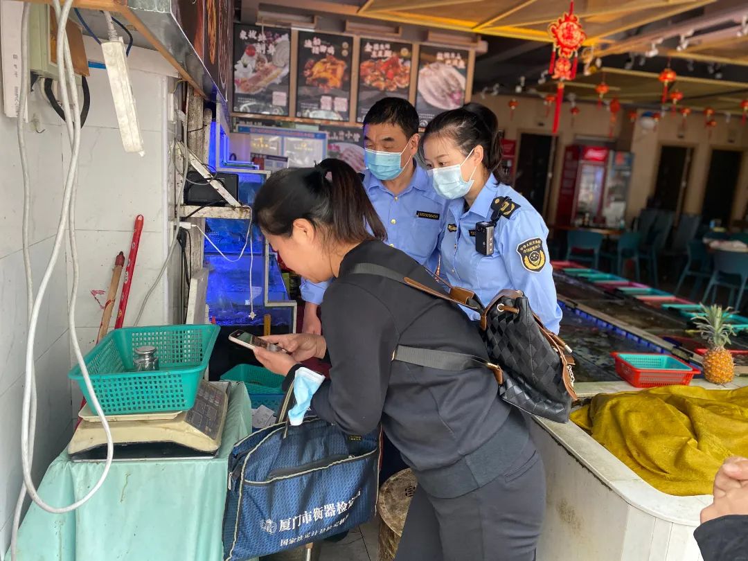 执法人员立即对商家进行严肃教育,指导其立刻整改,并针对未及时清理过期食品等问题进行立案调查。 某海鲜大排档存在“作弊秤”问题 短斤缺两是消费者深恶痛绝的行为,是市场监管“零容忍”的重拳打击对象,湖里区持续出击,确保市场公平,助力实现放心消费的“第一道防线”。 4月26日下午,执法人员联合衡检站工作人员在江头市场附近的海鲜大排档聚集区检查。 检查过程