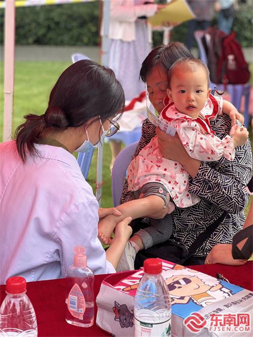 在小儿推拿志愿服务摊位,居民们带着孩子们现场体验。东南网记者 卢超颖 摄