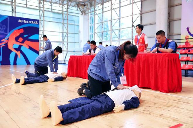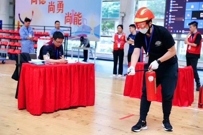 实操技能竞赛现场,来自湖里区湖里街道、殿前街道、江头街道、禾山街道、金山街道,以及湖里区教育、工信、卫健、应急(危化)、市政等行业领域共计100人组成的10支队伍,围绕消防安全(扑救初期火)、心肺复苏、急救处置、检伤分类、搜索标识识别、气道异物梗阻急救、简易担架制作、救援绳索八大场景展开精彩的技能比武。