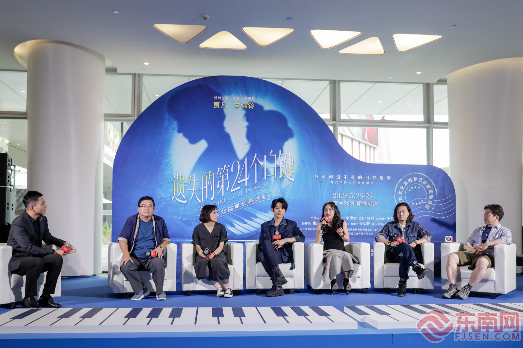 原创舞台剧《遗失的第24个白键》主创见面会。(闽南大戏院供图) 东南网5月21日报道(本网记者 柳绿 通讯员 傅子韬)5月20日下午,“让我们在5月相爱”闽南大戏院原创舞台剧《遗失的第24个白键》主创见面会举行,台湾果陀剧场艺术总监梁志民,主演贾凡、李炜铃等主创人员出席本次活动。这部舞台剧将于5月26日、27日在闽南大戏院大剧场迎来首演,并预计在北京、广州、成都、泉州、江西等全国各省市展开巡演。 聚焦世界文化遗产,舞台创作注入“厦门基因” 2022年初,闽南大戏院特别委约台湾果陀剧场创作舞台剧《遗失的第24个白键》。该剧以鼓浪屿琴岛钢琴博物馆中一架缺失了中央C琴键的古钢琴为线索,串联起横跨三代人的三段恋情,三条感情线犹如旋律中的复调般叠加流动,共同绘就了一幅爱情、音乐、厦门情怀交织的暖心画卷。 作为一部讲述厦门故事的舞台剧,《遗失的第24个白键》结合了老厦门的悠悠往事和风土人情,将“世界文化遗产”鼓浪屿的日光岩、皓月园、菽庄花园等重要地标在移步换景里做了巧妙的舞台呈现;此外,百年前“厦门号”的历史记忆也被有机地融入情节表达中。闽南大戏院从城市历史中汲取养分,运用这一厦门航海史上的传奇事件编排出恰逢其时的文艺作品,不仅深度联结了厦门历史风貌与城市人文肌理,也为城市文明赋予了全新的艺术脉动。