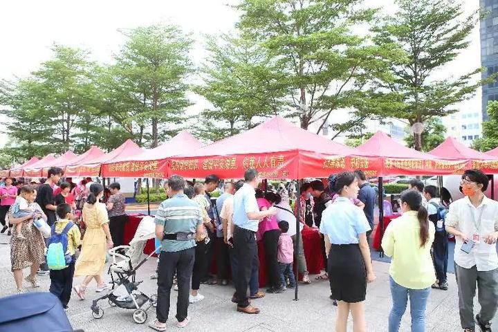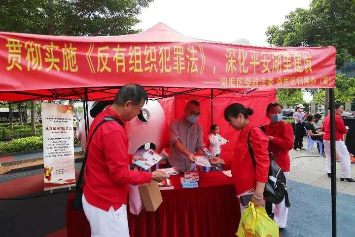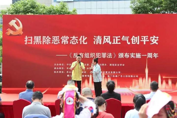 为持续深入宣传贯彻《反有组织犯罪法》,进一步营造扫黑除恶浓厚氛围,切实提升群众扫黑除恶好评率。 5月23日下午,厦门市湖里区扫黑办联合禾山街道在湖里区火炬新科广场隆重举行以“扫黑除恶常态化、清风正气创平安”为主题的《反有组织犯罪法》颁布实施一周年宣传活动。区委政法委、禾山街道办事处分管领导莅临现场,区委政法委、区法院、区检察院、湖里公安分局、区司法局等10余家单位参加了此次宣传活动。