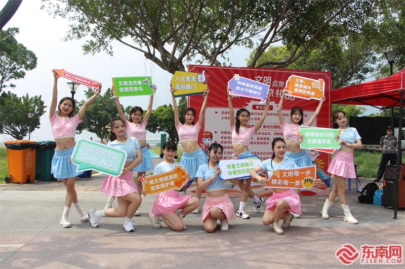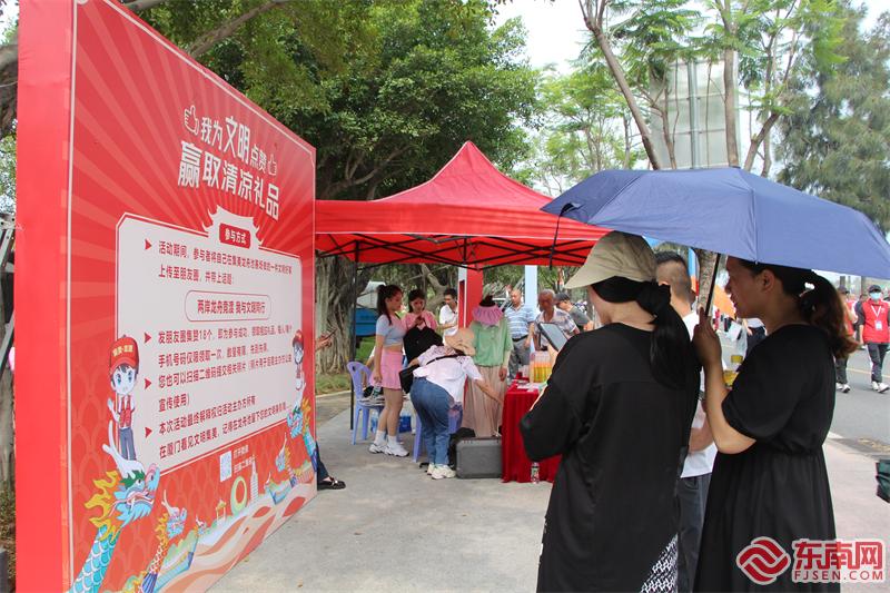 观众扫码“我为文明点赞”打卡活动(东南网记者 李霖 摄) 亮点2 线上线下 为文明点赞 如果说红马甲志愿者是将文明理念默默带到大家身边,“两岸龙舟竞渡 我与文明同行”文明倡导宣传活动就是以丰富多样的互动形式,为观众送上了文明好礼。 “文明,就是城市最美的风景”“我在文明的集美等你”……龙舟池畔几处人流量较大地点,均设置了文明打卡点,吸引游客合影拍照、主动传播,并通过《两岸龙舟竞渡 我与文明同行》倡议书,引导市民游客“做文明秩序的自觉守护者、做自身安全的第一责任人、做绿色出行的积极倡导者、做垃圾分类的主动践行者”。 不仅如此,主办方还发起“我为文明点赞”打卡活动,邀请市民游客上传自己在赛场周边做文明好事的照片,发起“两岸龙舟竞渡 我与文明同行”话题,换取清凉礼品;更有舞蹈演员手举文明标语牌进行多场快闪舞蹈表演,现场既“养眼”又“养心”。 “通过力所能及的小事,收获朋友圈‘点赞’,还能拿奖品。”在妈妈的带领下,集美实验幼儿园的张允哲小朋友在周边仔细“搜寻”,在草地上找到了一个烟头,并参与“我为文明点赞”打卡,母子俩直呼活动很有意义,“希望更多人参与进来。”