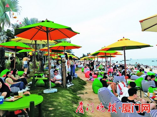 集美十里长堤景点游客火爆。 陈嘉新 摄 厦门晚报讯(记者 吴笛 戴懿 龚小莞 吕嘉捷 陈嘉新 实习生 赵睿洁)到网红打卡地拍照留念,在沙滩上吹海风、听音乐、品美食,连续多年到南普陀拍荷花,文明骑行既锻炼了身体又让身心舒畅……端午假期,市民纷纷走出家门,享受轻松惬意的休闲时光。 计划环岛60公里 意外参加了大型骑行 昨日是端午假期首日,记者来到集美十里长堤附近,发现现场已有不少市民游客,有的在拍照打卡留念,有的在草坪上铺上野餐布休憩打牌聊天,现场十分热闹。 也有市民选择不一样的方式过端午节,记者在走访过程中遇到一名骑行者邱先生,邱先生打算用3个小时进行约60公里的环岛骑行,以文明骑行的方式过节。他告诉记者,本来他想在上午进行环岛,骑到集美海堤入口的时候刚好遇到几个骑友往杏林湾方向去,就跟着过去凑凑热闹,现场报名参加了大型骑行活动,活动有四五百人参加。 邱先生说,他一直坚持锻炼,趁着端午假期闲下来,觉得还是多运动运动,既锻炼了身体也身心舒畅。他还坚持长跑11年了,已经连续参加过几届的厦门马拉松赛,“一开始以为长跑很无聊,没想到越跑越有意思,运动让自己更加自律,也能够挑战自我”。 到了傍晚,伴随着艺人弹奏出的轻快悠扬的旋律,市民游客迎着晚风,以草地为席,天空为幕,在音乐中释放自我。有的跟着节奏打节拍,有的跟着音乐舞动起来。 “在十里长堤,我可以感受到轻松的音乐氛围,而且旁边有海有夕阳,心情很愉悦,是一次全身心的放松。”游客林女士告诉记者。 草地上扎起帐篷 孩子描绘起假期画卷 昨天下午6点半,记者堵车半小时终于来到环岛路黄厝海滩玩月坡。海滩上放眼望去人头攒动,颜色鲜艳的阳伞和桌椅沙发,在沙滩边排开,市民游客或坐在这里聊天吃东西,或走到海水里戏浪拍照。有的人还在离沙滩比较远的草地上扎起帐篷,一家人吃着烧烤喝着啤酒,十分惬意。 记者在现场发现,一个帐篷旁还铺起好几米长的图画纸,几个孩子席地而坐涂涂画画,描绘属于她们的假期画卷。一旁的妈妈负责拍照,爸爸负责做好后勤保障工作。另一边的草地上,一个女孩坐在桌旁专注地看着书,桌旁还放着一杯咖啡。 市民杨女士告诉记者,她已经有好几年没来玩月坡了,没想到沙滩上的休闲设施和各种服务这么完善了。 连续多年到南普陀 拍荷花戴五彩绳