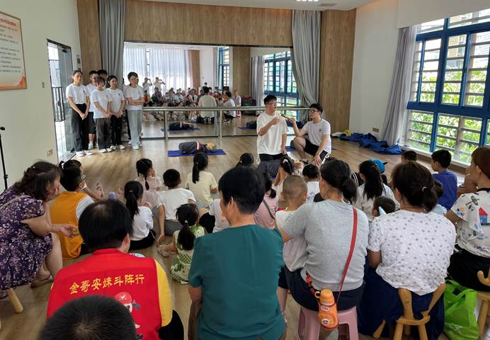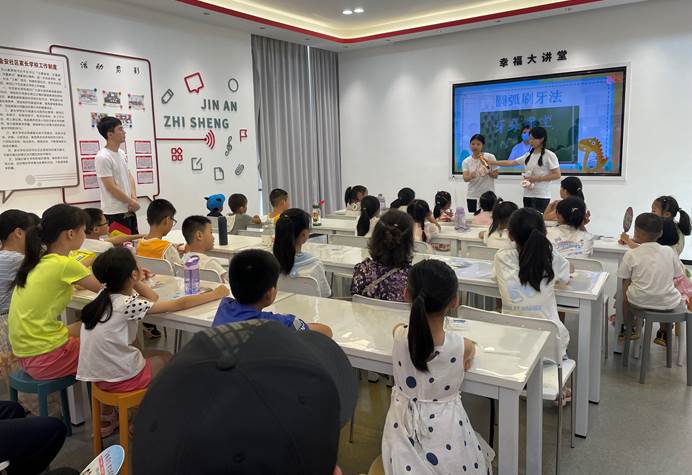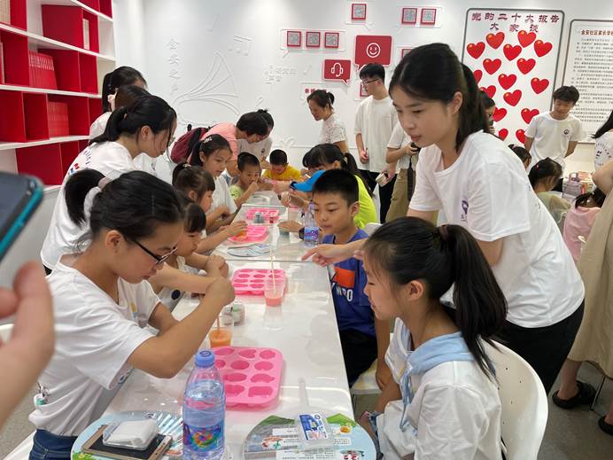 实践队师生参观“习习春风”馆 接着,实践队同学结合自己所学专业,向居民详细地教授了心肺复苏的操作方式、日常口腔护理及夏日护肤、选购防晒品的注意事项等内容。同学们还带领着社区的孩子们一起唱刷牙儿歌,教孩子们做手工肥皂,现场欢笑声不断。活动得到社区居委会工作人员的大力支持和居民们的积极参与,纷纷点赞厦医学子有本领、有方法、很热情。同学们获得感满满、幸福感满满、成就感满满。
