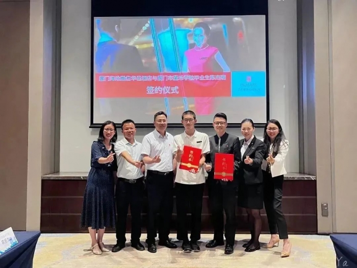 近日,厦门市嘉禾学校首届职高部毕业生陈杰瑞与厦门海沧融信华邑酒店(五星级)签订了劳动合同,开启了陈杰瑞同学的职业梦想之旅!签约现场,厦门市嘉禾学校书记、校长蔡振龙、教务处主任林世末、职高(2)班班主任王燕;厦门海沧融信华邑酒店人力资源总监修适、房务总监罗奋铭、行政管家温佛珍、培训经理纪宸超等齐聚一堂,共同见证陈杰瑞同学成长的精彩高光时刻。 这份劳动合同的签订,既是社会、政府、企业、学校对特殊教育需要学生的关爱、肯定和支持,更是爱心企业社会责任感和使命感的体现。特殊教育需要学生就业是个体实现与社会互动、融入社会生活、提升生活质量的重要渠道,是他们实现自我价值,产生社会归属感的重要方式。在助力特殊教育需要学生就业方面,高中职业教育发挥着举足轻重的作用。 湖里区举办2023年青少年法治夏令营活动