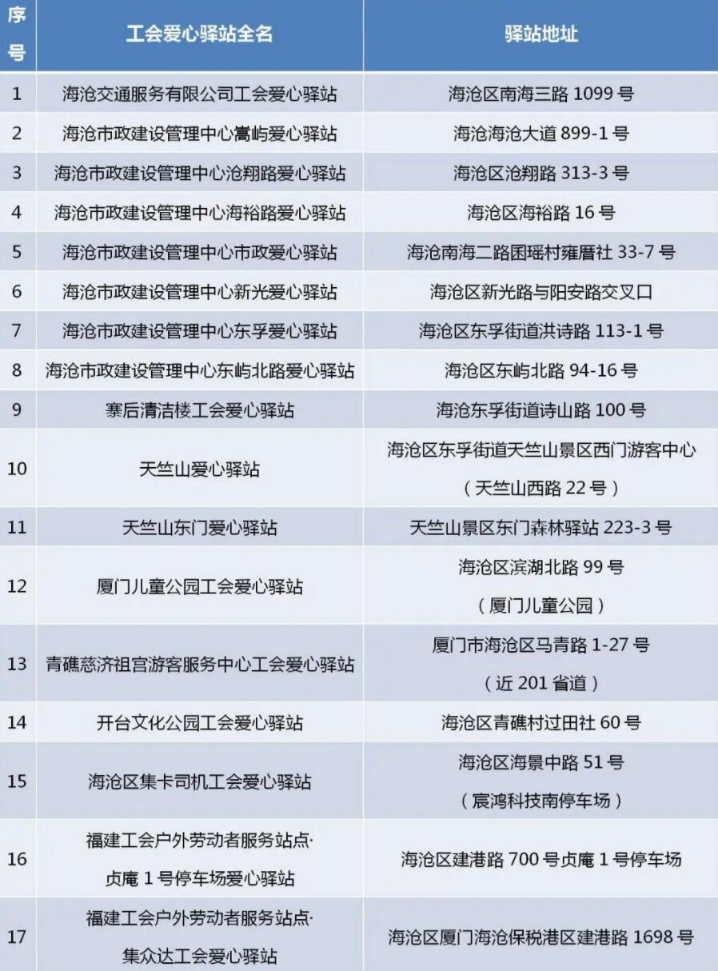 司机们在爱心驿站休息。陈淑华 摄 东南网7月11日报道(记者 卢超颖 通讯员 陈亚丽)炎炎夏日,高温炙烤,近日,厦门海沧又一爱心驿站揭牌,为户外劳动者撑起防暑降温“乘凉伞”。 7月10日上午,位于厦门海沧建港路南侧的贞庵1号停车场爱心驿站正式揭牌。该爱心驿站由海沧城建开发公司建设及进行日常管理,站内配备有饮水机、微波炉、桌椅、空调、冰箱、电视、应急药箱、维修工具箱、职工意见信箱、体温测量仪器、雨伞、针线包、无线网络等,且单独设有卫生间,并配备了淋浴室。此外,海沧区总工会还为司机朋友准备了防暑降温礼包。 爱心驿站的投用,为周边工作的货车司机打造了一处难得的“清凉地”。货车司机陈友彬在海沧已工作8年,他说:“我觉得这个爱心驿站做得非常好,你看有冰箱、空调、热水,配置很齐全!要是下雨天或者天气热,还有遇到修车、卸货的空档时间,这个地方就能让我们好好休息一下,特别方便。” 2018年起,海沧区总工会推动爱心驿站的建设,如今在海沧已有17所“工会爱心驿站”,环卫工、养路工等特殊岗位工人饮水难、用餐不便、工间休息难等实际问题得到妥善解决。目前,这些爱心驿站已面向户外劳动者免费开放,为他们在酷暑送上清凉。今年,海沧区总工会“夏送清凉”高温慰问一线职工活动启动,7月10日,先后深入海沧区森林防灭火指挥部、中通快递、鼎心货运、CBD1号主体甩项工程、新阳市政管理站、捷太格特、蓝湾科技等场所,为户外作业、高温车间等一线职工送去工会关怀。