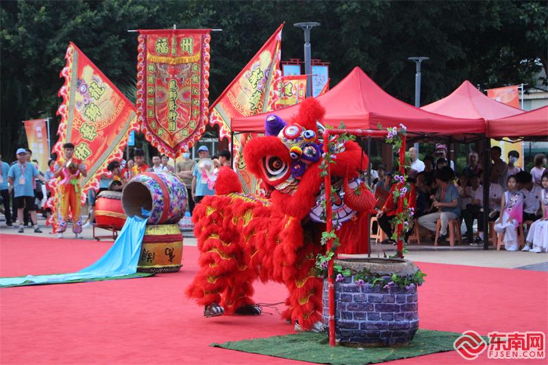 队员们灵巧地操纵道具,表演醒狮衔鱼(东南网记者 李霖 摄)