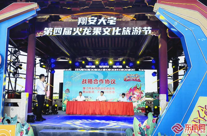 翔安大宅第四届火龙果文化旅游节开幕(东南网记者 夏菁 摄) 东南网7月21日报道(记者 夏菁)在火龙果丰收的季节,厦门市翔安区香山街道大宅社区又一次迎来了专属于自己的节日。21日傍晚,“声动大宅·FUN肆呼吸”——翔安大宅第四届火龙果文化旅游节开幕。此次活动将持续至7月23日,市民和游客可与火龙果来一次亲密接触,感受乡村振兴的魅力。 此次活动由翔安区委员会、翔安区人民政府指导,翔安区文化和旅游局、翔安区农业农村局(乡村振兴局)、翔安区商务局、翔安区人民政府香山街道主办,大宅社区委员会、厦门香境旅游投资运营有限公司承办。 文化旅游盛宴 迎接丰收喜悦 在香山脚下,1400亩火龙果田成了这场文化旅游盛宴的绝美背景。随着嘉宾按下手中的能量柱,洁白的火龙果花缓缓绽放,“第四届大宅火龙果文化旅游节”正式开幕。 夜幕降临,充满激情与活力的“追光音乐会”瞬间点燃了全场氛围。抖音百万级网红林童学、潇公子以及2023中国好声音福建省总决赛总冠军陈启寿闪亮登场,现场尖叫声、掌声四起。 而在上千亩田间灯海里,火龙果花缓缓绽放,10位花仙子在花海中翩翩起舞,大宅版“绿野仙踪”首次亮相,为大家带来了更新奇的体验。 大宅社区党委书记兼居委会主任陈锦芳表示,此次火龙果文化旅游节通过村民涂鸦、农夫市集、花仙子巡游快闪、追光音乐会、村民甜品客栈等多种互动形式,结合大宅火龙果赏花摘果的特色体验,呈现大宅一二三三产融合的成果,吸引更多年轻人将目光聚焦到大宅。同时,活动还激发村民在乡村振兴中的主人翁意识,其中80%的市集摊位由村民自发组织,未来将打造农夫市集常态化运营。