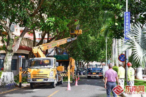 园林养护工人们正分工有序,熟练地运用高空升降车,对道路两侧的大树进行疏枝作业,以增加其抗风能力,消除安全隐患。夏海滨 摄