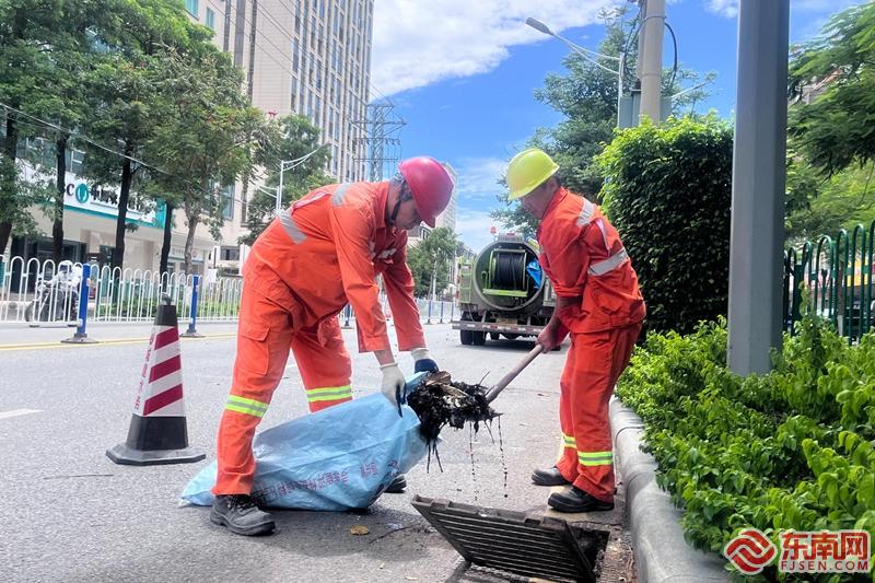 工作人员对城区内市政排水设施进行巡查,提前对易涝积水点路段下水井进行清淤。(余雪燕 摄)
