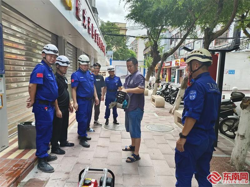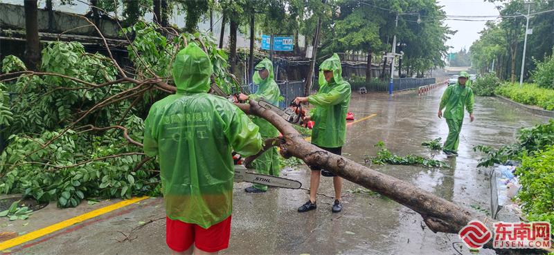 28日上午,驰鹰救援队顶着狂风暴雨在侨英街道兑山村下蔡社开展清障工作。(驰鹰救援队供图)