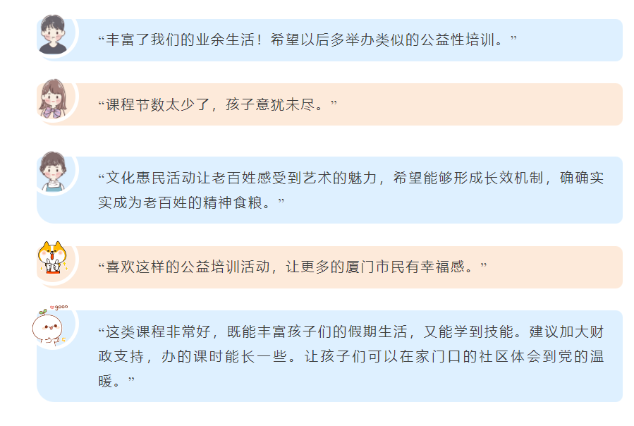 “文化进万家·走进新时代文明实践所(站)”文化惠民活动火热进行中,本次活动由湖里区委宣传部联合区委文明办、区文旅局、区文联、区社科联和各街道在全区广泛开展,面向5至75周岁的市民群众提供涉及13大文化艺术门类的2000多节公益文化培训课程。 目前一部分课程已结业 截至上周末 区委宣传部共收到1078位学员的受众评单 活动满意度高达99.7%