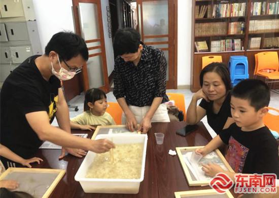 古法造纸DIY(金山街道供图) “传承非遗 ‘纸’等你来”活动通过了不起的造纸和古法造纸DIY等环节,带领亲子们了解纸的历史、制作过程和发展。大家从薄薄的一张纸中见识了古人的智慧和毅力,通过亲子互动交流,锻炼亲子的动手、动脑能力。 此外,金山街道图书馆还在今年暑期首次招募“书香小小志愿者”,开展整理书籍、图书分类、书籍上架、引导读者正确归还图书等基本工作。孩子们在图书馆里发挥本领,增进对图书馆的了解,培养了他们的社会实践能力。 |
