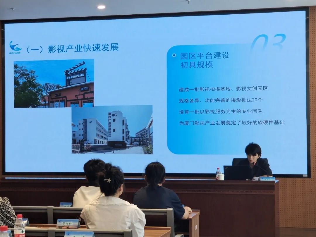 04、业务培训 8月30日的四场业务培训课上,湖里区邀请了多位市行业主管单位业务骨干,围绕影视文化企业在发展中所面临的实务问题、行业发展趋势,开展多主题授课,提升学员业务能力,拓宽学员视野。 厦门市电影行政审批流程介绍: 在课上,厦门市电影局干部卢正铎介绍了2023年“厦门市影视产业发展情况”“电影审批流程”等方面内容,通过详细案例与学员交流业务上遇到的实际问题,派驻审批窗口的工作人员在课下进一步为企业解惑释疑。