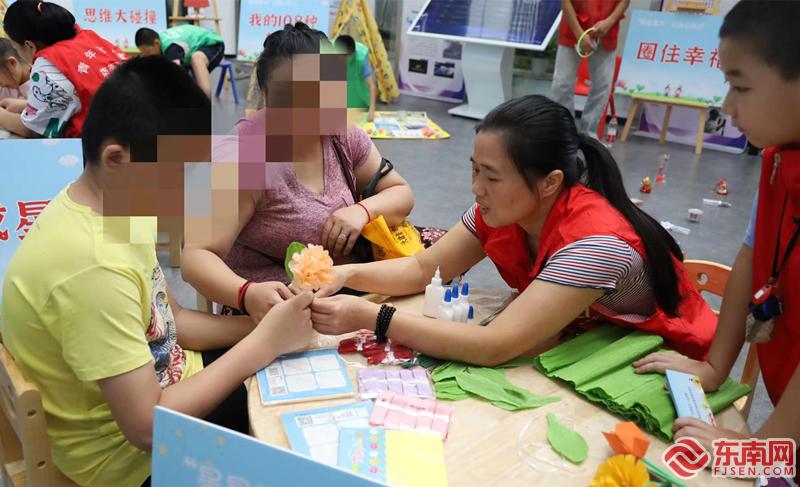 “星星的孩子”们在志愿者的引导下学习做手工花朵(杏林街道未成年人保护站供图)