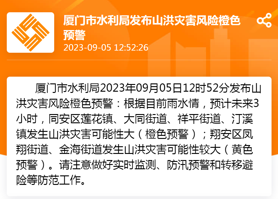 5日12时52分 厦门水利局发布 山洪灾害风险橙色预警