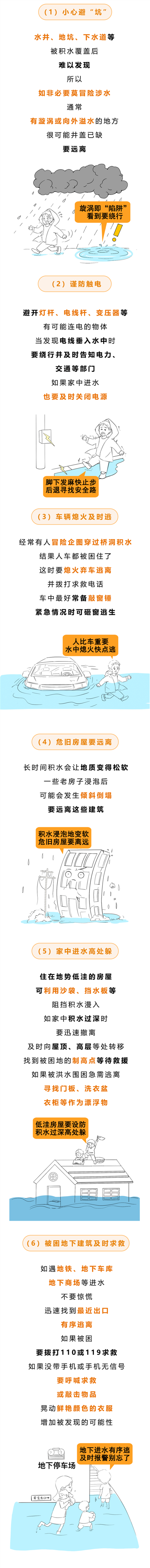 湖里街道组织网格员、志愿者全面细致地排查、清理辖区隐患点位,做好人员转移工作,协助物业做好防汛准备;前往第六空间、闽南古镇A部等多个易涝点位和小区疏通下水道,协调解决临时断电、转移人员等工作;江头街道对低洼区域、危旧房屋等进行排查,同时通过短信、微信群等多种渠道,即时传达监测预警信息,做好人员转移;禾山街道针对辖区易涝点,做好积水排泄,备好防汛物资,劝导游客远离木栈,避免发生溺水安全事件;金山街道摸清并转移危险区域人员,对地下停车场、燃气管道设施等开展“地毯式”安全隐患排查,确保低洼地带、地下空间等区域安全。 温馨提醒 短时间内的强降水 极易造成城市内涝 不仅对人们出行造成困扰 当我们的城市发生内涝时 如何避险?