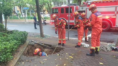 强降雨导致 湖里区安岭二路某处 地面坍塌,人员受困 湖里区消防救援大队接到调派指令 前往坍塌处将男子救出
