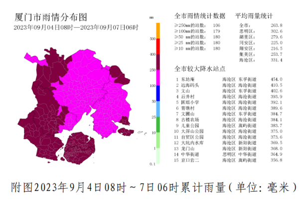(厦门市气象局供图) 东南网9月7日讯(记者 刘玮)厦门市气象台9月7日7时发布消息,今天厦门市降级发布全市“暴雨预警Ⅲ级”,局部镇街仍有大雨到暴雨。 过去24小时,厦门共有22个镇街出现100毫米以上的强降水,最大累计雨量出现在同安区莲花镇小坪森林公园,达150.1毫米。过程以来(4日08时~7日06时)全市平均面雨量263.8毫米,最大出现海沧区东孚街道东坊庵,达454.0毫米(见附图)。预计今天厦门局部镇街仍有大雨到暴雨。 厦门市气象局提醒广大市民,地质灾害气象风险等级较高,须持续关注。 |