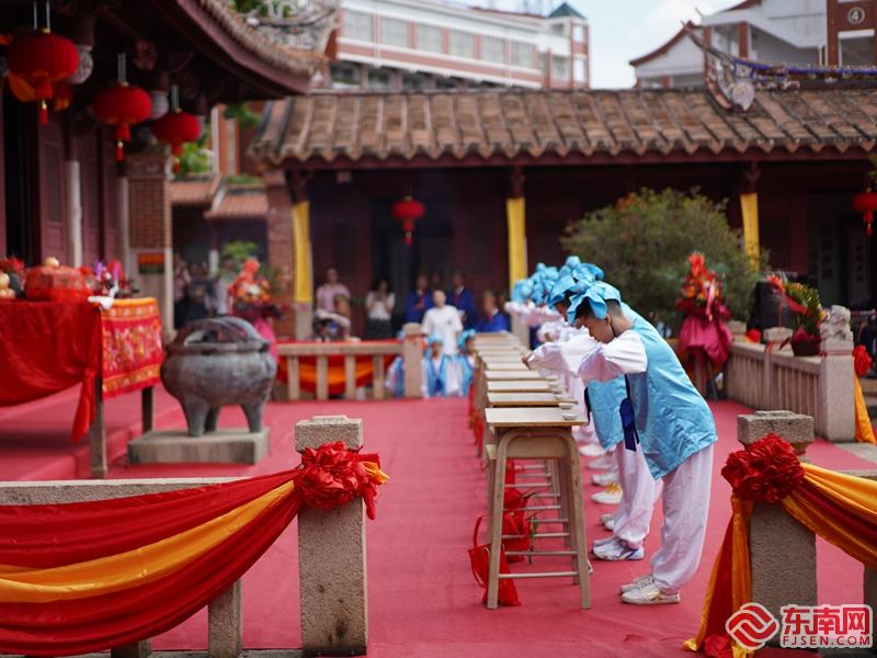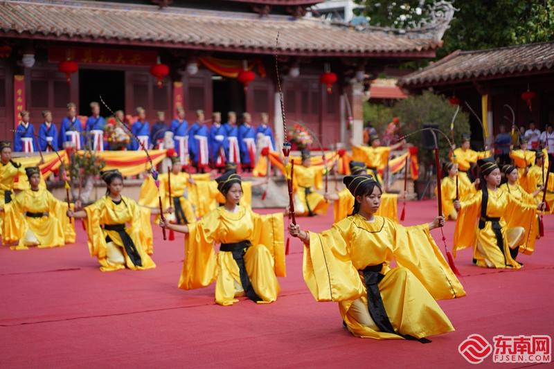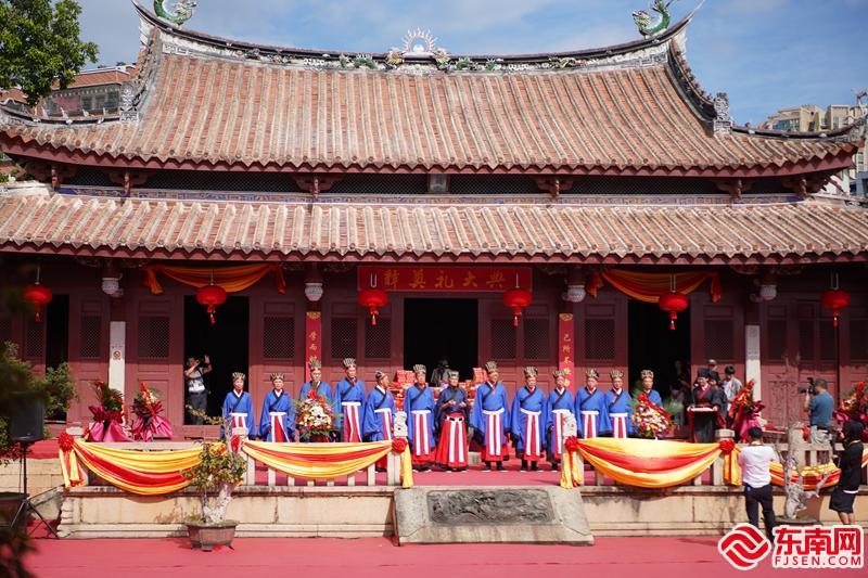 祭孔大典(东南网记者 邹玒 摄) 东南网9月28日讯(记者 文洁 邹玒 通讯员 杨心亮 余雪燕)在礼乐和鸣中赓续历史文脉,28日上午,2023年厦门(同安)孔子文化节在同安孔庙隆重举行。2023年是孔子诞辰2574周年,本届孔子文化节以“儒行两岸 尊师尚学”为主题,用庄重简洁的仪式纪念孔子,传承和弘扬中华优秀传统文化。 自2009年首届祭孔典礼成功举办以来,厦门(同安)孔子文化节影响力不断增强,已成为具有厦门特色的文化品牌。本届孔子文化节紧扣《中共中央国务院关于支持福建探索海峡两岸融合发展新路 建设两岸融合发展示范区的意见》精神,首次邀请两岸专家学者就同安先贤陈永华开创台湾文教事业先河、以儒家思想推进两岸文化融合发展的历史影响展开学术研讨,追溯同安与台湾一脉相承的文脉渊源,共证两岸文化同根同源。
