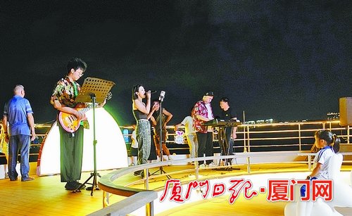 市民游客在游轮甲板欣赏乐队表演。(记者 汤海波 摄)