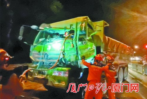 厦门:两车相撞驾驶室严重变形 消防员救出被困司机