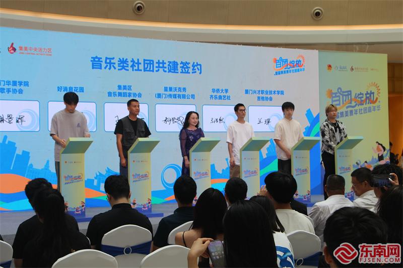 “社会社团+高校社团+青年头部企业”签约共建(东南网记者 李霖 摄) 打造强大“朋友圈” 集美青年社团联盟成立 当前,集美青年社团蓬勃发展,集美青年活力满满。以青年的关注点、兴趣点为切入点和着力点,启动仪式上,集美青年社团联盟正式成立。联盟以“社会社团+高校社团+青年头部企业”为架构联合共建,加强青年社会组织培育,推动青年参与社会实践,实现青年成长与城区发展同频共振、融合发展。现场还达成了体育、影视、音乐三类社团共建,扩大青年社团“朋友圈”,进一步助推共建单位资源共享、发展共赢。 启动仪式上,集美青年社团联盟还发布了“百团伙伴计划”。该计划将通过青年社团日、优秀社团评选、社团训练营、社会服务挑战等,搭建青年社团交流成长平台,整合青年社团成长伙伴资源,探索陪伴集美青年社团成长的一种新路径。 集美团区委相关负责人表示,联盟将常态化开展社会服务、专业培训、交流研讨等活动,激发联盟桥梁纽带作用,培养青年成长为城区建设的后备军、主力军,实现青年与集美建设的“双向奔赴”。 本次活动还增设“百团绽放”线上专区,邀请集美青年社团入驻“青春集美”数字平台。据悉,除了常规的社团风采展示外,该平台后续将为入驻社团提供成员纳新、活动协助等服务;还将设置“社团热门榜单”,评选“活跃星级社团”,搭建线上+线下连接互通渠道,为青年社团获取政策、资源、活动等信息提供便利。