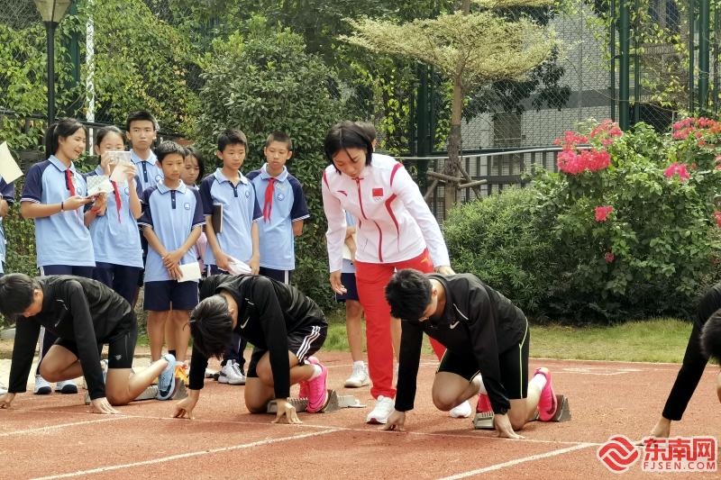 葛曼棋指导校田径队的学弟学妹们(东南网记者 刘玮 摄) 几位亚运冠军还来到操场上与学校体考队的队员们进行了专业交流。作为本届亚运会田径女子100米、4×100米接力的双料冠军,葛曼棋也亲切地指导起校田径队的学弟学妹们。比赛场上霸气十足的“小哪吒”瞬间化身“温柔学姐”,学生们直呼“好幸福!”。 在此前的东京奥运会上,葛曼棋曾因扎上了“哪吒头”而被众人记住。今年的杭州亚运会上,她依然坚持着自己独特的造型。在采访中,她告诉记者,未来在重大比赛中,她还将延续这个造型,对她而言这是一种心理暗示,能够带来好运。