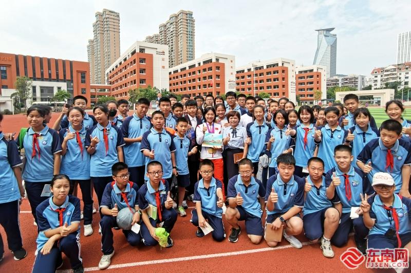 葛曼棋与湖滨中学师生合影(东南网记者 刘玮 摄) 东南网10月16日讯(记者 刘玮)在刚结束不久的杭州亚运会中,厦门运动员交出亮眼的成绩单,4名健儿共获7金1银1铜,创下厦门代表团征战亚运最佳战绩!10月15日上午,四位杭州亚运会冠军——葛曼棋、虞琳敏、林文君、陈梓桓走进厦门市湖滨中学,与师生以及他们的“粉丝”们面对面交流。 现场,大家激动地挥舞国旗,呐喊着冠军的名字并送上鲜花,校园瞬间沸腾秒变“追星现场”,学生们纷纷上前与冠军合影,并请冠军签名。 此次也是葛曼棋时隔多年后重回母校。“上一次看到大家是在钻石联赛,学弟学妹们手举横幅为我加油,内心特别感动。这次回来感慨万千,曾经在这里求学的记忆仿佛都回来了。”葛曼棋说,和校内好友一同参赛为学校争得荣誉,是她在母校最难忘的回忆之一。
