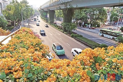 莲前卧龙西路天桥,黄色三角梅耀眼。记者 陈理杰 摄