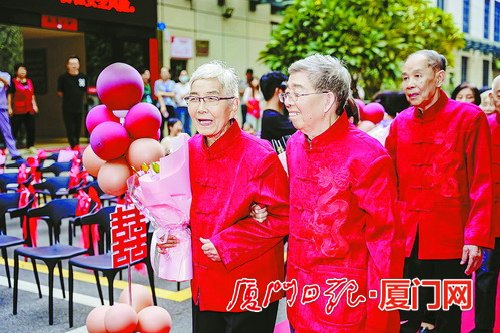 翔安市政集团泊车管理有限公司党支部志愿者为老人们煮制“兜面”。(记者 邵凌丰 通讯员 许心怡 摄) 【暖心】 17对金婚夫妻携手秀恩爱 湖里区和通社区举行金婚活动 厦门日报讯(记者 庄筱婧)10月20日下午,“‘乐’金婚,心心相‘通’”金婚活动在湖里区湖里街道和通社区居委会举行,辖区17对携手相伴超过50年的金婚夫妇欢聚一堂“秀恩爱”,共同见证了一场温馨而别致的金婚纪念仪式。 在浪漫的音乐声中,17对金婚夫妇身着中式礼服,缓缓走过红毯。在大家的见证下,他们共同完成了金婚宣誓、互戴戒指、共饮合卺酒等“爱的互动”,追忆着从相识到相依相伴的岁月。 在大家羡慕的目光里,张有忻爷爷手挽着妻子刘春发奶奶上台,他们已经携手走过60个年头。这对和蔼可亲的老人家,大大方方和台下年轻人们分享了他们相濡以沫的爱情故事。尽管年过八十、头发花白,张爷爷眼神里还是难掩对刘奶奶的爱意,他笑眯眯地说,两人因为爱走到一起,吵架不翻旧账、不争输赢。 此次活动由湖里区妇联,和通社区党委、居委会、新时代文明实践站主办,厦门市培善社会服务中心承办,并携手厦门市委组织部、湖里区文化和旅游局、厦门国宇健康管理中心有限公司、厦门东渡第二小学、厦门第六中学、厦门市湖里区东渡阳光幼儿园等单位共同举办。 |