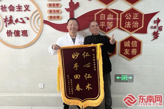 王赞让(右)向郑颂毅(左)送上锦旗(东南网记者 李霖 摄)